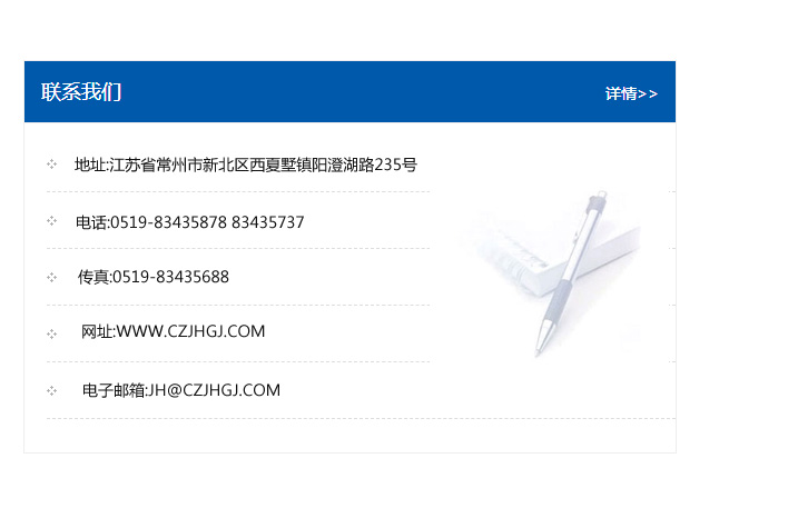 地址:常州市新北區友邦商務大廈1幢16、17層  電話:0519-85101652  傳真:0519-85112595  郵編:213022  網址:www_cz-jiayue_cn.jl-cn.com  郵箱:xiajifengaa@163.com